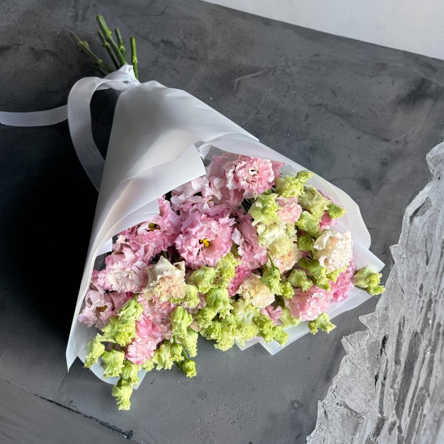 На фото букет 7 нежно-розовых эустом. В составе: эустома (лизиантус) 7 шт, дизайнерская упаковка 1 шт, атласная лента 1 шт, . Все цветы свежие и ароматные, букет красиво оформлен и отлично подходит для подарка. Доступна доставка цветов или самовывоз.
