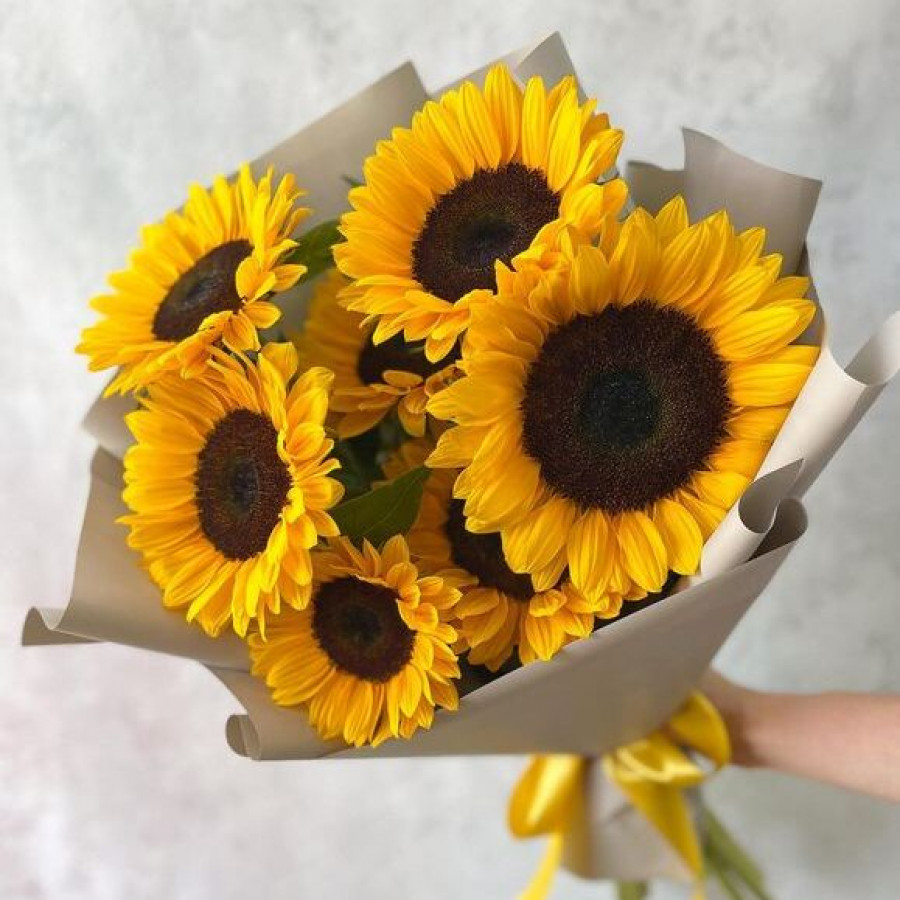 На фото букет из 7 подсолнухов. В составе: подсолнух 7 шт, крафт-бумага 1 шт, атласная лента 1 шт, . Все цветы свежие и ароматные, букет красиво оформлен и отлично подходит для подарка. Доступна доставка цветов или самовывоз.