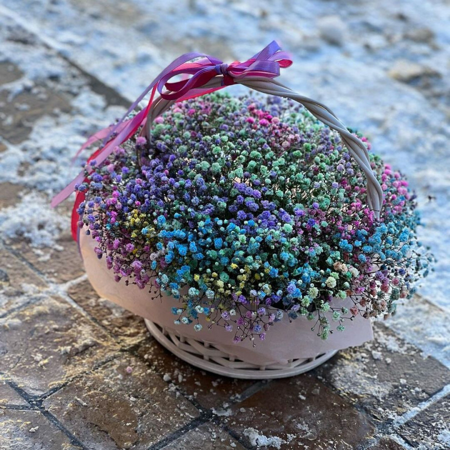 На фото композиция из 15 радужных гипсофил в корзине. В составе: гипсофила 15 шт, корзина (s) 1 шт, атласная лента 1 шт, . Все цветы свежие и ароматные, букет красиво оформлен и отлично подходит для подарка. Доступна доставка цветов или самовывоз.